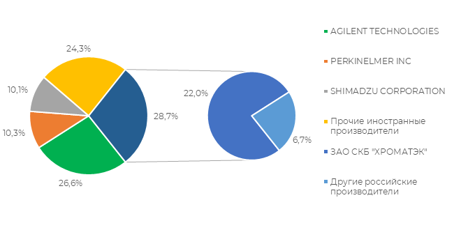 На рынке хроматографов российские производители занимают всего лишь 28,7%, которые в основном могут конкурировать на рынке газовых хроматографов, на жидкостных – слабая позиция, а ионные хроматографы в России вообще не производятся.