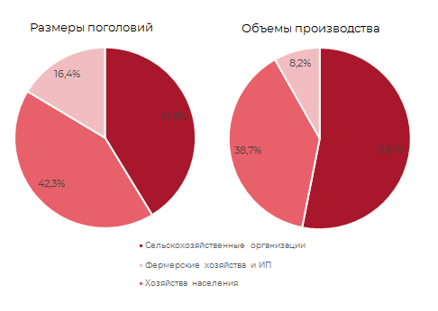 Доли крупных сельскохозяйственных предприятий (другое название — агрохолдинги) и личных подсобных хозяйств по итогам 2018 года были примерно одинаковыми, причем в последние 10 лет они постоянно снижались. Зато активно росло поголовье у фермеров — с 2% в 2000 году до 16,4% от общего количества дойных коров в 2018 году.