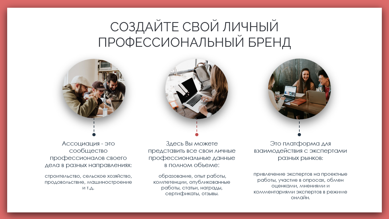 Ваш опыт, компетенции, достижения – все на одной странице. Используйте Ваш профиль в Ассоциации как свою профессиональную визитную карточку. Покажите в один клик свои профессиональные достижения деловым партнерам, потенциальным работодателям, кому считаете нужным.